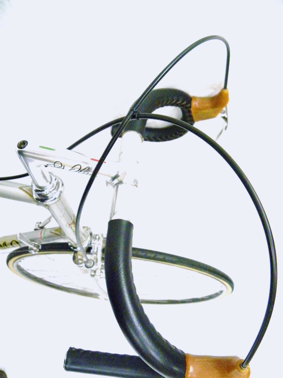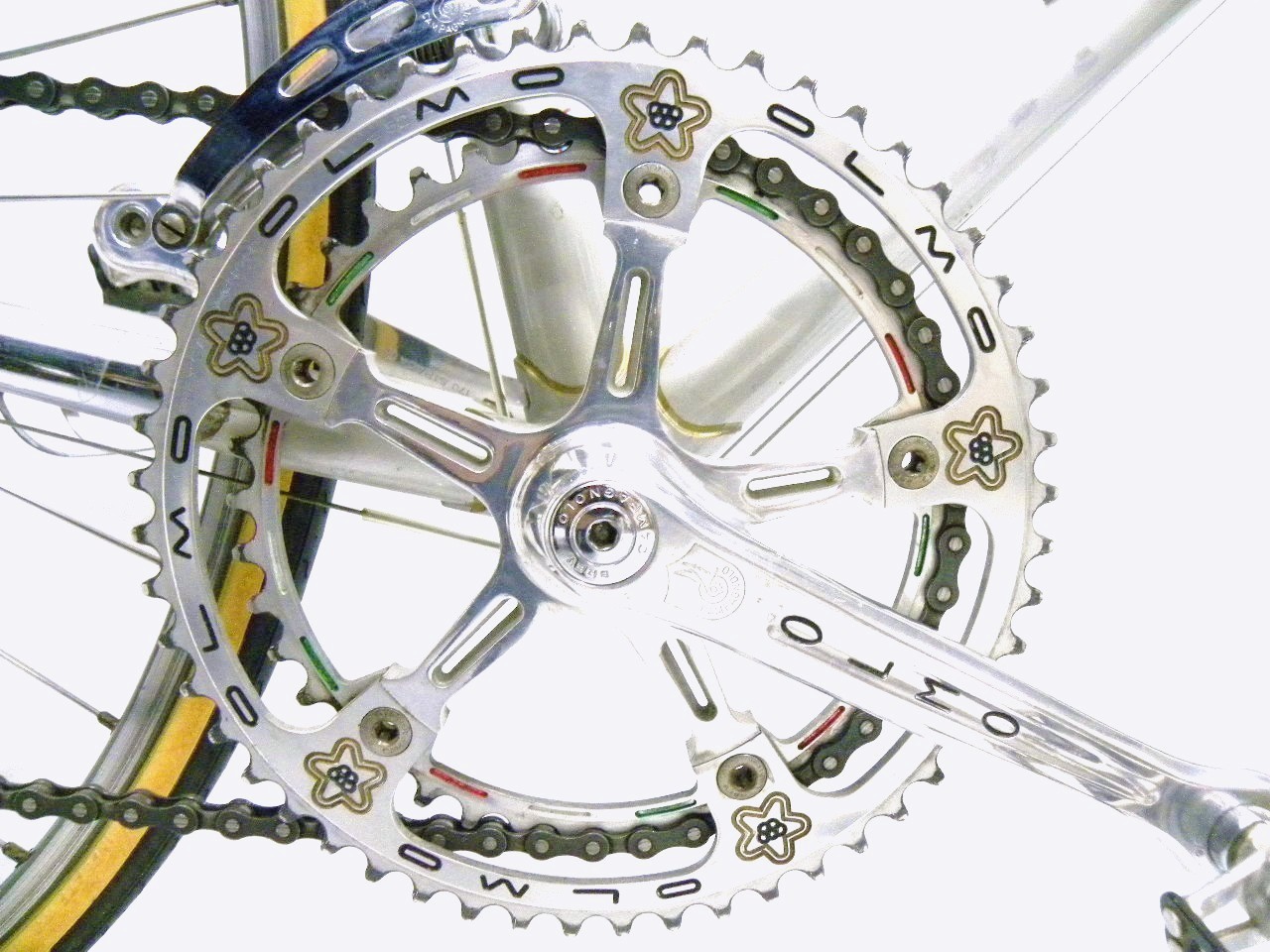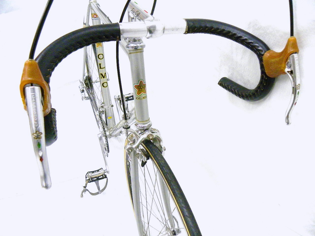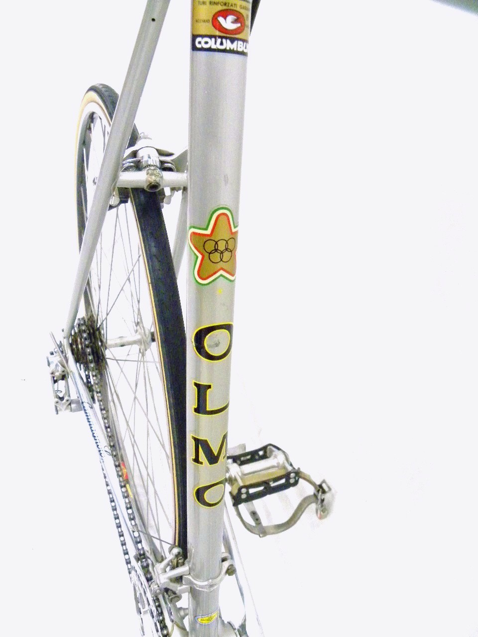 - The Story – Acquired on-line pre-eBay days. Paint in relatively worn out condition and required much touching up. Fully panto Campagnolo group with other Olmo specific parts.