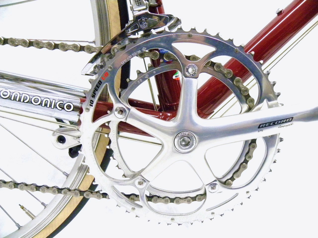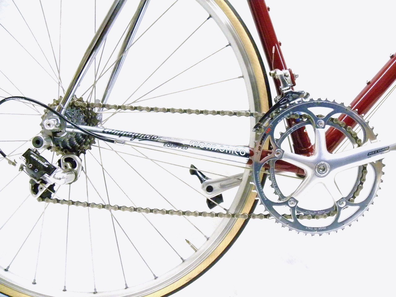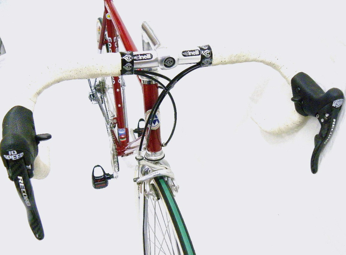 - The Story – Frame custom built for me. Ordered through Terry Shaw of Shaw Cycles in San Jose. Antonio himself was there to do the fitting and his son, Mauro was doing the interpretation. Antonio had asked to bring a favorite bike to the meeting. After some measuring and discussion of what I was expecting and what I wanted to use the bike for we went out to the back parking lot where he wanted to see me riding the bike I brought in my normal riding style, on the drops, sprinting and riding off the saddle. He was taking notes and then he nodded and said that he could build me a bike. I wanted the bike to reflect the steel bikes of the vintage era with chrome front and rears and chrome lugs. I also specified the shade and color of paint I wanted and I believe the frame was sent to Jim Allen in Southern California for paint after it was built in Italy. I equipped it with Campagnolo Record 10 group opting for the carbon bits even though it did not look vintage but it was contemporary.