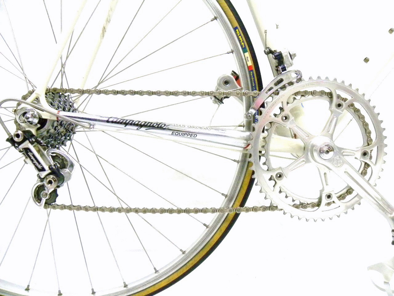 - The Story – Acquired from eBay in the early days. I asked the seller about the make of some of the specific parts that was not shown in the pictures and his answer was “everything is Campagnolo”. When I got the bike, it was in very poor condition with many non-Campy parts. When I confronted the seller his answer was “all I saw was Campagnolo written everywhere so, how was I to know”. Welcome to the world of eBay! The bike was re-painted in-house in a pearl white with the decals and graphics masked.